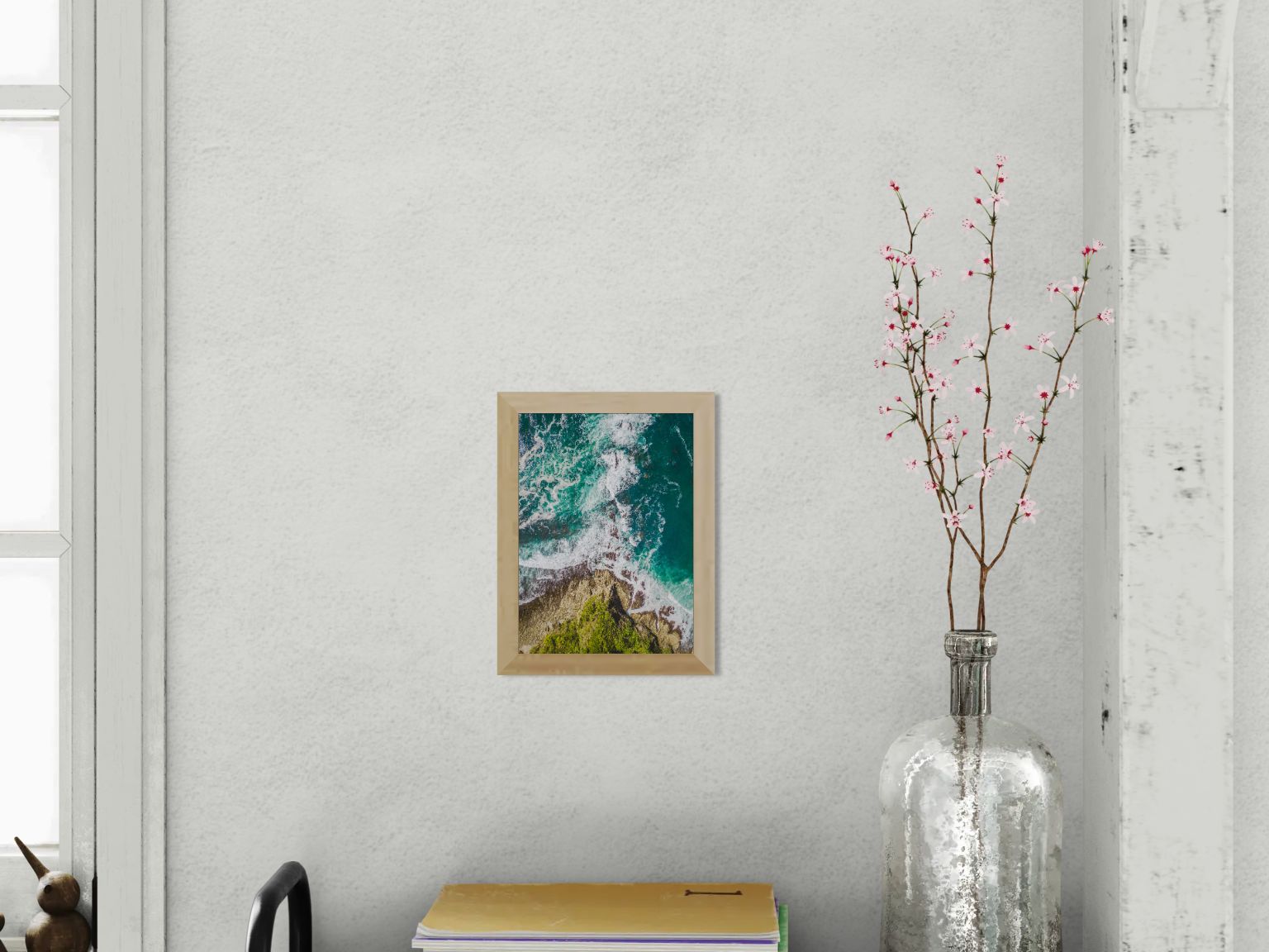 Where wild jungle meets restless sea, Ocean’s Edge Barrigona captures a moment of raw coastal beauty from above. This aerial fine art photograph reveals the vibrant textures of churning blue-green waters and thick sea foam colliding with weathered cliffs. A sharp, triangular patch of vivid green juts out near the base of the composition, anchoring the image in contrast to the vast, moving sea above. Presented in a dramatic portrait orientation, with land grounding the frame and the ocean rising above, this piece evokes both stillness and movement making it a striking centerpiece for spaces inspired by nature, balance, and bold design.