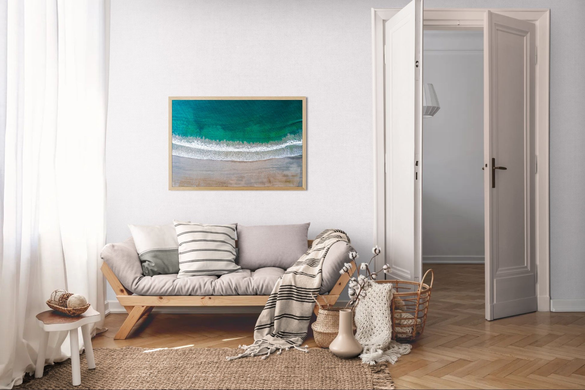 This minimalist yet rich composition radiates peace, balance, and coastal beauty. Perfect for interiors that seek warmth, stillness, and the soft rhythm of the ocean.