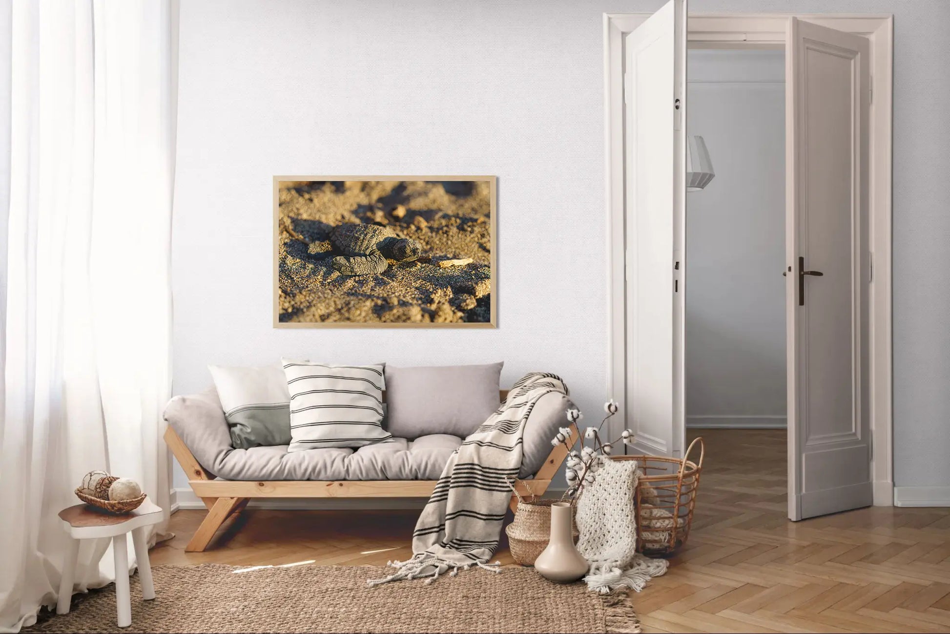 Sun-Kissed Start captures the first steps of a sea turtle hatchling at sunrise. The golden light wraps the tiny creature in warmth as it begins its life’s journey toward the sea. A poetic and powerful symbol of resilience and hope.